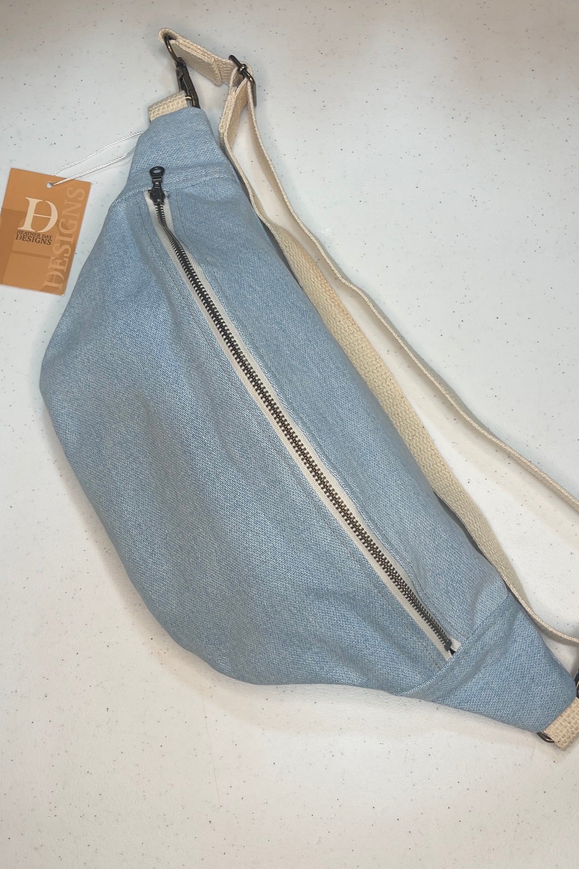 These crossbody bags are handmade by Heather Day. Exterior is made out of denim pants, utilizing the back pant pockets as a back pocket on the bag. Each bag is embellished with other parts of the pants, like the belt loops and back label in order to make each bag unique from each other. Interior is lined with 100% woven cotton fabric with a pocket.